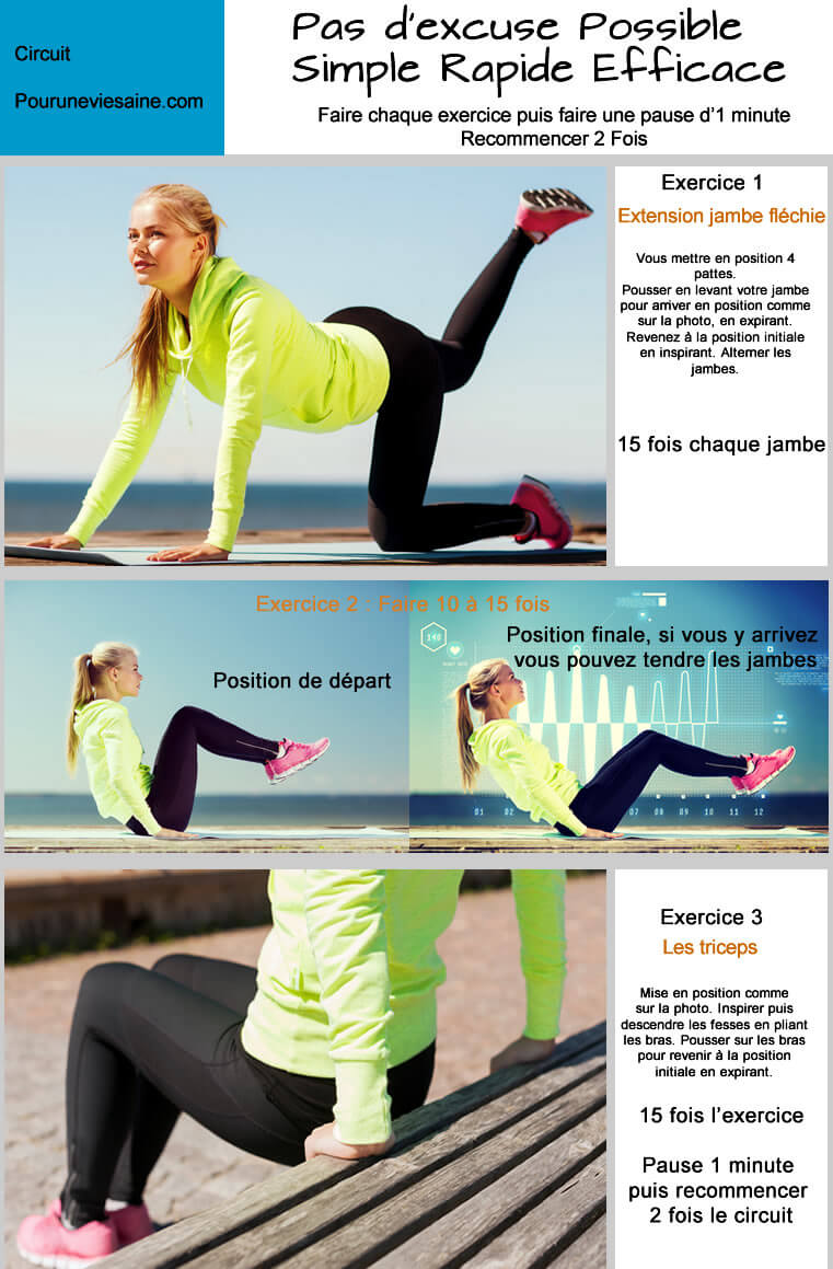 Puis faites chaque exercice, faites une pause de 1 minute, puis répétez le circuit 2 fois.